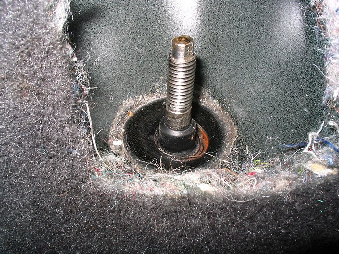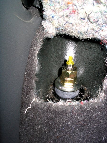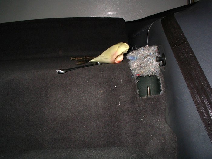 locating the upper bolts behing the rear seats. With the seats folded, a flap in the