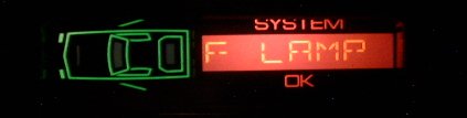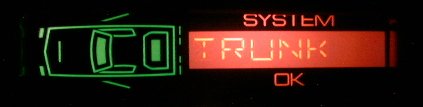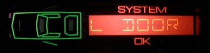 monitor of all doors, rear hatch, coolant and washer levels, and headlamp/parking-lamp/tail-lamp condition. If anything is amiss, a small graphic will appear on the outline of the car in the area of the anomaly, and the appropriate text will scroll onto the little screen. Here's a couple of examples of this monitor in action (these were all output as part of the self-test... had there