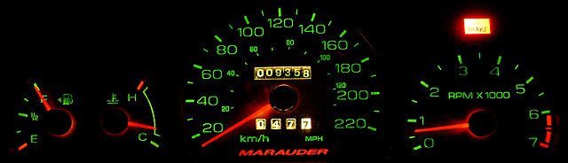 spot the rest of the analog instrument panel, white-faced with black markings that radiate green and